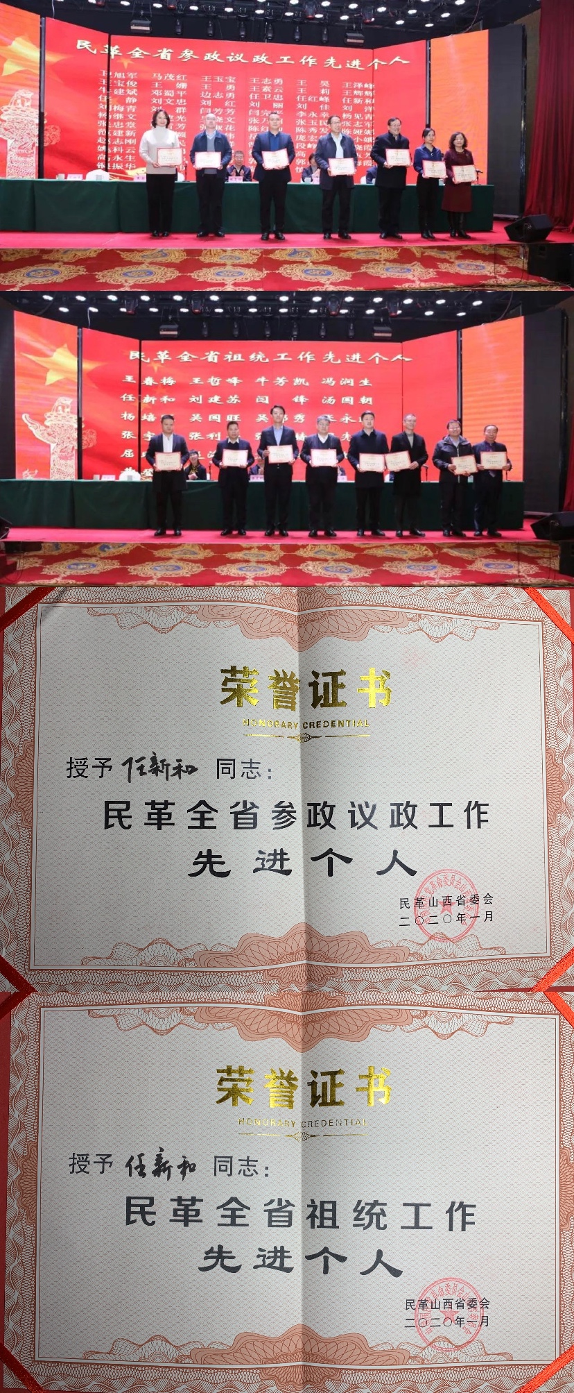 2017年以来,任新和老师积极建言献策,参政议政取得新成效,作为尖草坪区政协委员提交社情民意、提案议案27项,其中被省、市两级政府采用10项,在“庆祝新中国成立七十周年、人民政协成立七十周年书画摄影展”活动中表现突出,获得省政协感谢。此外他充分发掘山西“根祖文化”“关公文化”资源优势,通过多渠道、多途径增进了两岸文化交流,促进了民族认同、文化认同、国家认同。