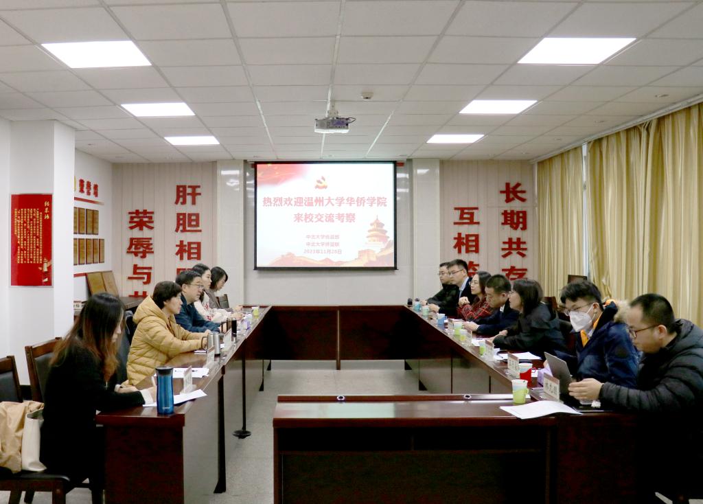 夏瑞丽部长首先对包含丽院长一行的到来表示热烈欢迎,对省侨联长期以来对校侨联的关心支持和成长帮助表示衷心的感谢,并表示希望与温州大学华侨学院在项目合作、人才引进、技术交流等方面进行深度合作,共同为新形势下的侨联工作建设贡献新作为,进一步加强两校侨留联交往互动,增进了解,共促发展。随后,校侨留联副秘书长乔志琴就校侨留联五年来的发展建设经验,以及校侨留联在社会服务、组织建设、干部培养等方面的特色工作进行了重点汇报。