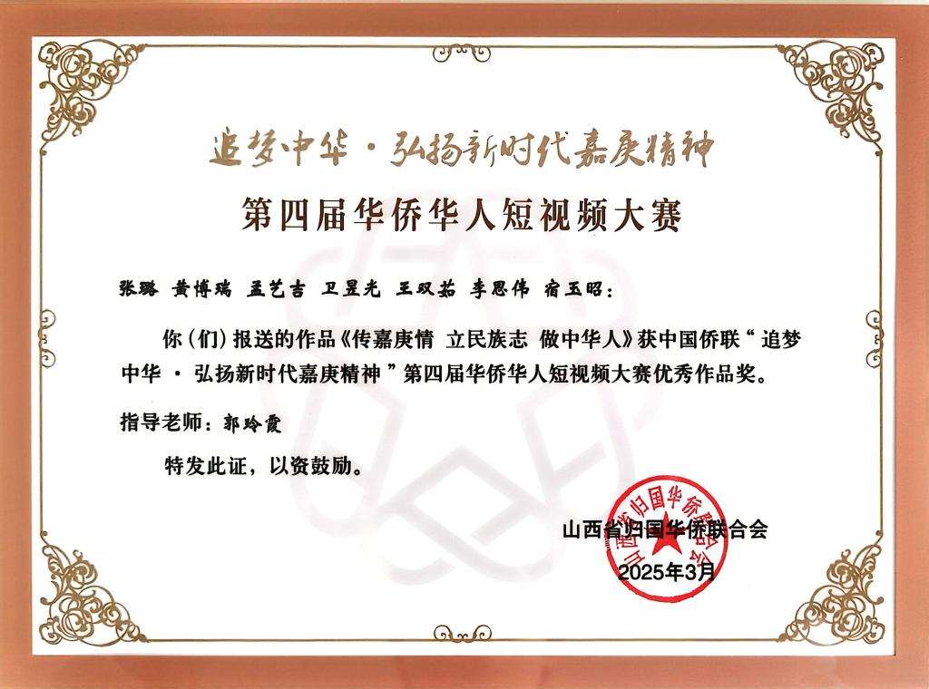 在此次大赛筹备阶段,校党委统战部高度重视,广泛动员校内师生参与创作,推荐选送短视频作品《传嘉庚情立民族志做中华人》,经评选从海量参赛作品中脱颖而出,荣获“优秀作品奖”,这也是山西省侨联系统在本次大赛中唯一获得殊荣的作品。同时,我校侨留联荣获山西省侨联“优秀组织奖”。