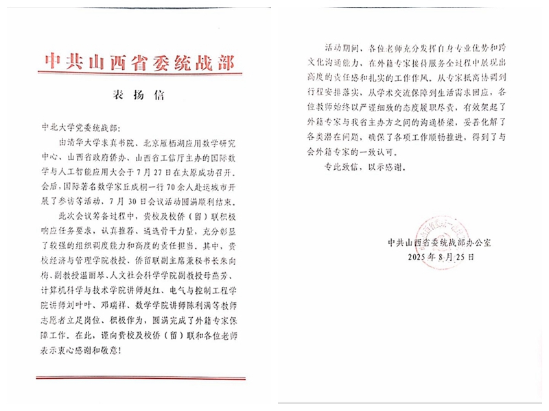 8月25日,中共山西省委统战部向学校发来表扬信,对我校及校侨联在“国际数学与人工智能应用大会”及其延伸活动中的组织协调与服务保障工作给予高度肯定。表扬信特别指出,我校经济与管理学院教授、侨留联副主席兼秘书长朱向梅、副教授温丽琴,人文社会科学学院副教授母燕芳,计算机科学与技术学院讲师赵红,电气与控制工程学院讲师刘叶叶、邓瑞祥,以及数学学院讲师陈利满等7名教师,在外籍接待服务全过程中充分发挥专业优势,立足岗位、积极作为,圆满完成了外籍专家保障工作。省委统战部对我校及校侨留联的积极贡献表示衷心感谢与敬意。