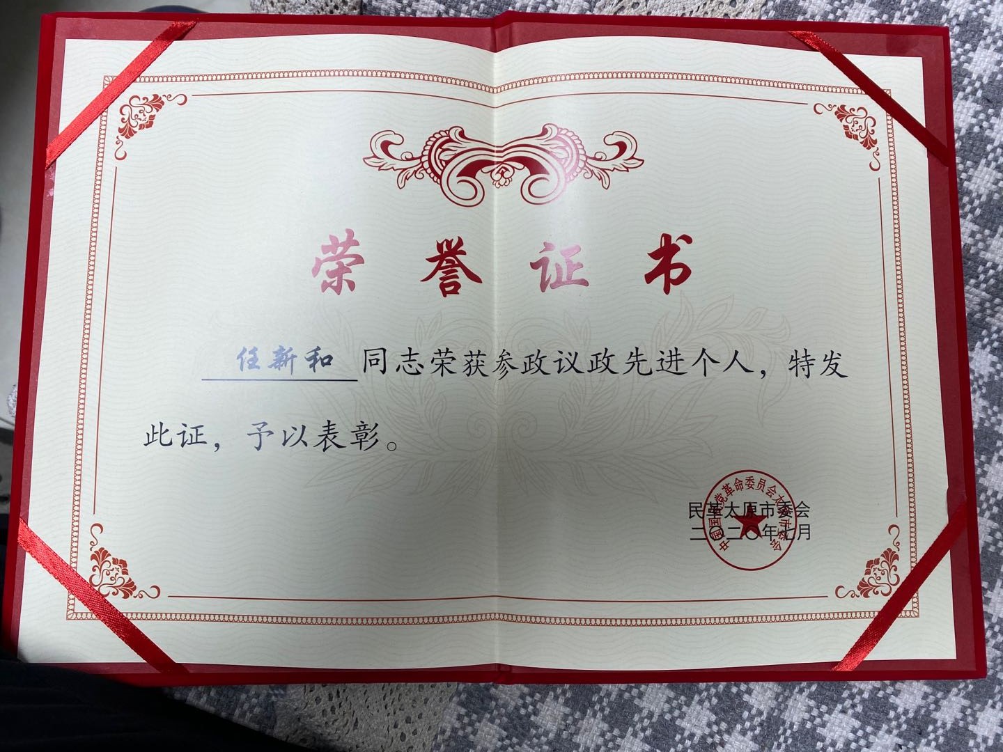 会上,我校区政协委员、民革省直属中北大学支部委员会副主委、艺术学院教师任新和获民革太原市委“参政议政先进个人”荣誉称号。这是民革太原市委会对民革党员参政议政的积极肯定。任委员表示在今后工作中,将继续坚定不移的坚持党的领导,履职尽责,为山西发展献计献策。