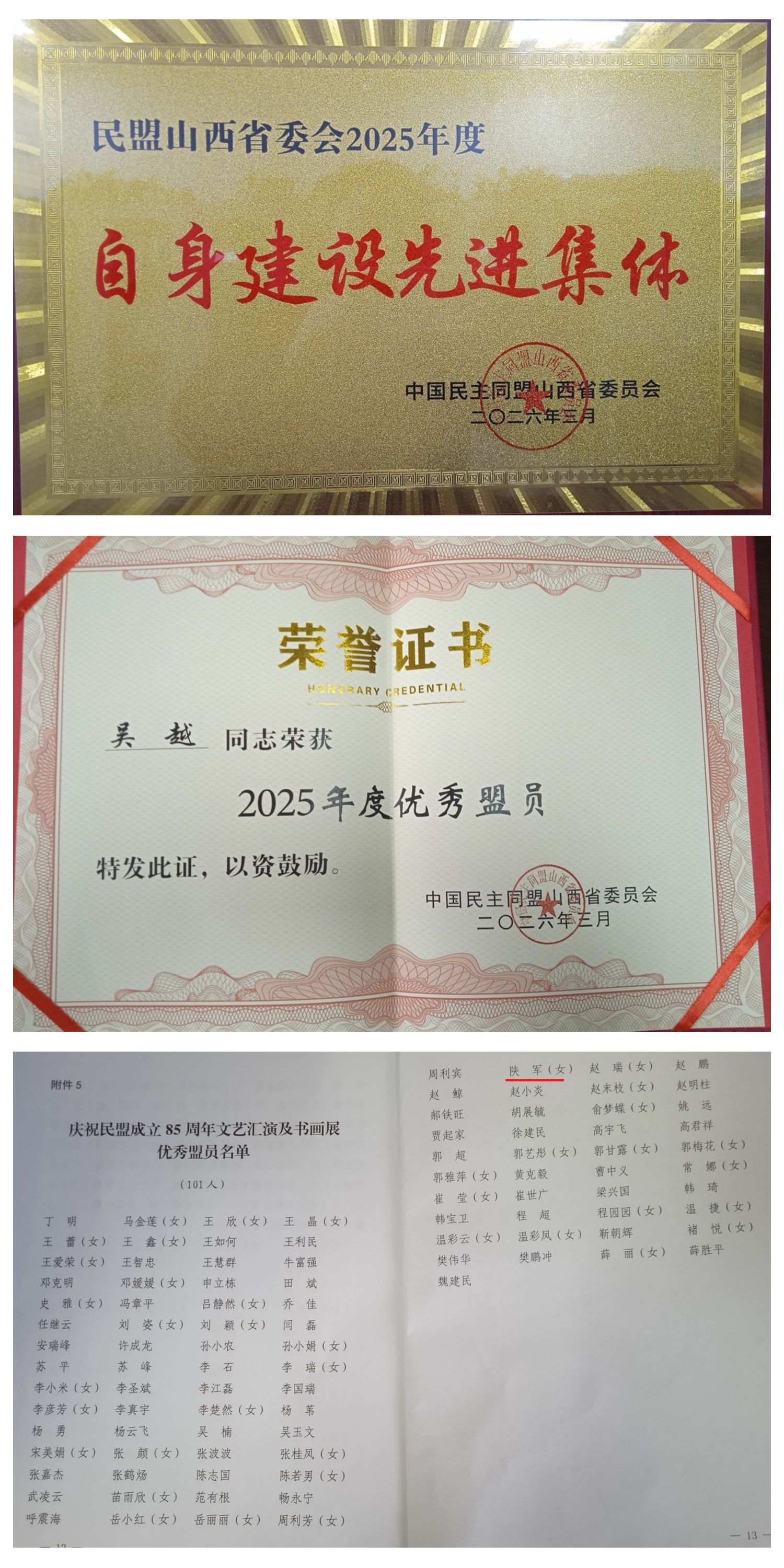 会议传达学习了全国两会精神,听取并审议通过了《中国民主同盟山西省第十二届委员会常务委员会工作报告》和《中国民主同盟山西省第十二届委员会内部监督委员会工作报告》,审议并通过了《中国民主同盟山西省第十二届委员会第五次全体(扩大)会议决议(草案)》。会上表彰了过去一年在自身建设、履行职责中表现突出的集体和个人。民盟中北大学委员会喜获民盟山西省委会 “2025年度自身建设先进集体”荣誉称号。民盟中北大学委员会吴越荣获民盟山西省委会“2025年度优秀盟员”。民盟中北大学委员会陕军荣获“庆祝民盟成立85周年文艺汇演暨书画展优秀盟员”。